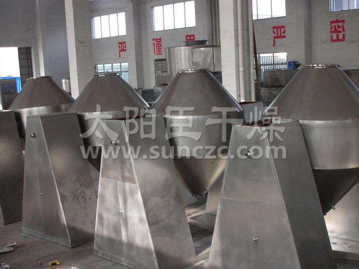 雙錐回轉真空干燥機為雙錐形的回轉罐體,罐內在真空狀態(tài)下,向夾套內通入蒸汽或熱水進(jìn)行加熱,熱量通過(guò)罐體內壁與濕物料接觸,濕物料吸熱后蒸發(fā)的水汽,通過(guò)真空泵經(jīng)真空排氣管被抽走。由于罐體內處于真空狀態(tài),且罐體的回轉使物料不斷的上下內外翻動(dòng),故加快了物料的干燥速度,提高干燥效率,達到均勻干燥的目的。